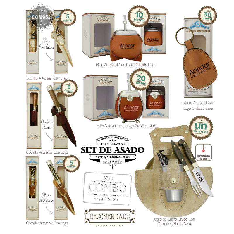 Combo Exclusivo Artesanal De 15 Cuchillos (5 Trenzados/5 Madera/5 Trenzado fino) + 30 Mates (10 Cuero Vaqueta /20 Calabaza Con Alpaca) + 30 Llaveros De Cuero Grabado Incluye Un Set Criollo Cubiertos/Plato y Vaso Grabado