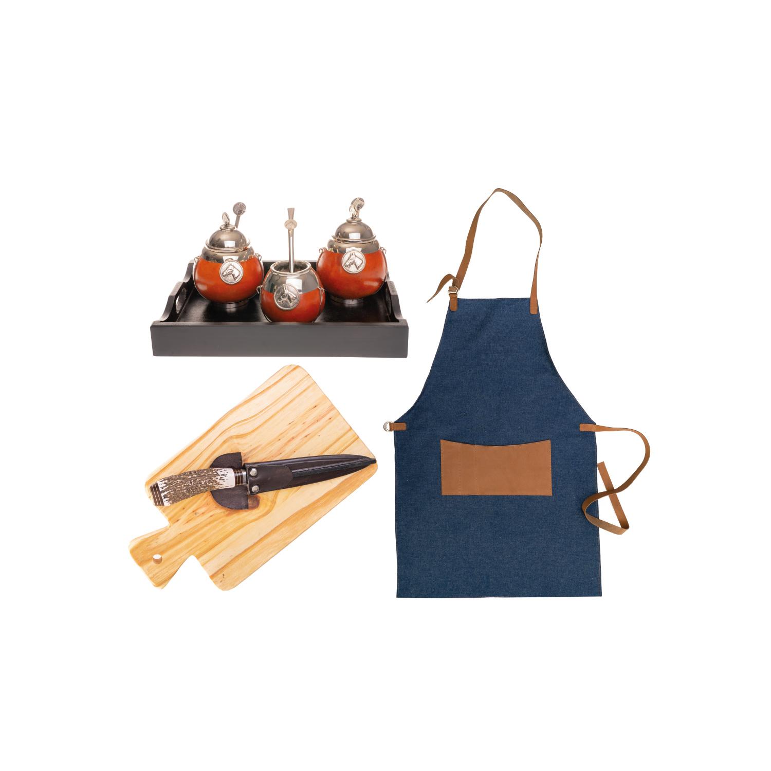 Combo Campero (1 Delantal Asador Jeans, 1 Set Matero De Calabaza Yerbera/Azucarera y Mate/Bombilla Con Alambre y Dije De Alpaca En Bandeja, 1 Cuchillo Inox. Schmieden 14 Cm Encabado En Eco Ciervo Vaina De Cuero,1 Tabla Estilo Clásico 28×15)