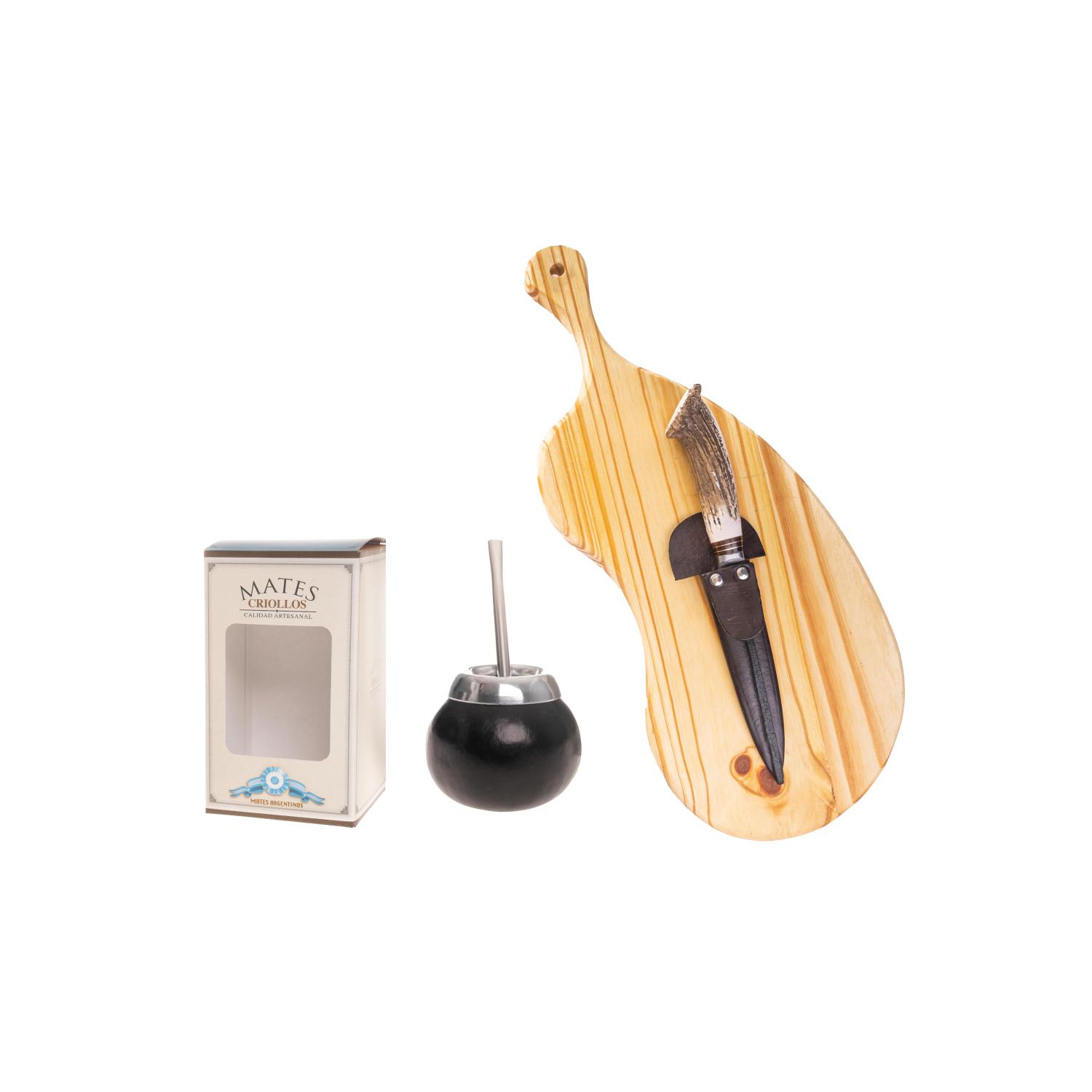 Combo Campero (1 Cuchillo Eco Ciervo C/Roseta 14 Cm Acero Inox Vaina Vaqueta, 1 Mate De Calabaza Con Virola (MAT855) Con Bombilla Grabado Con Caja, 1 Tabla Modelo De Campo 40 x 19 cm )