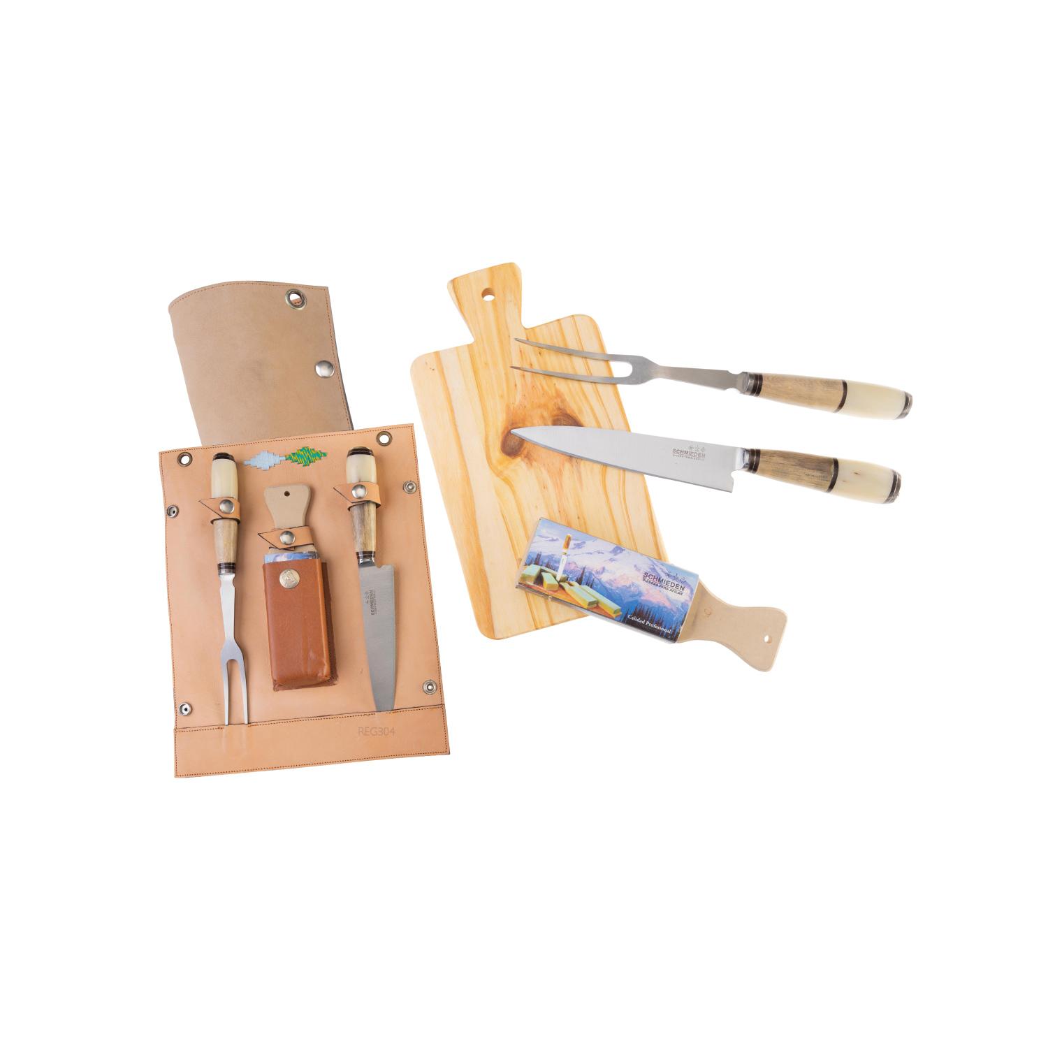 Combo Set Quincho 1 Tablita Estilo Clasico 32×17 1 Juego CuchilloTenedor y Piedra De Afilar Acero Inox 18 Cm Encabados En Maderas Hueso Con Estuche De Cuero
