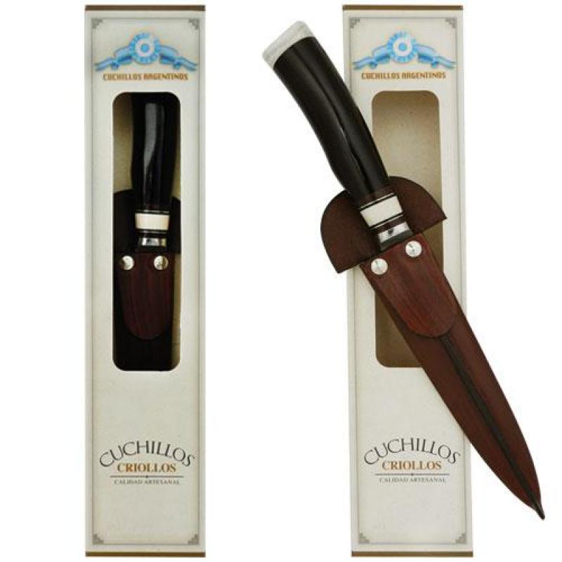 Cuchillo Hoja Acero Inox. Schmieden 14 Cm Encabado En Eco Asta Con Detalles, Botón En Ciervo y Vaina De Vaqueta (CUC182) Grabado C/Caja