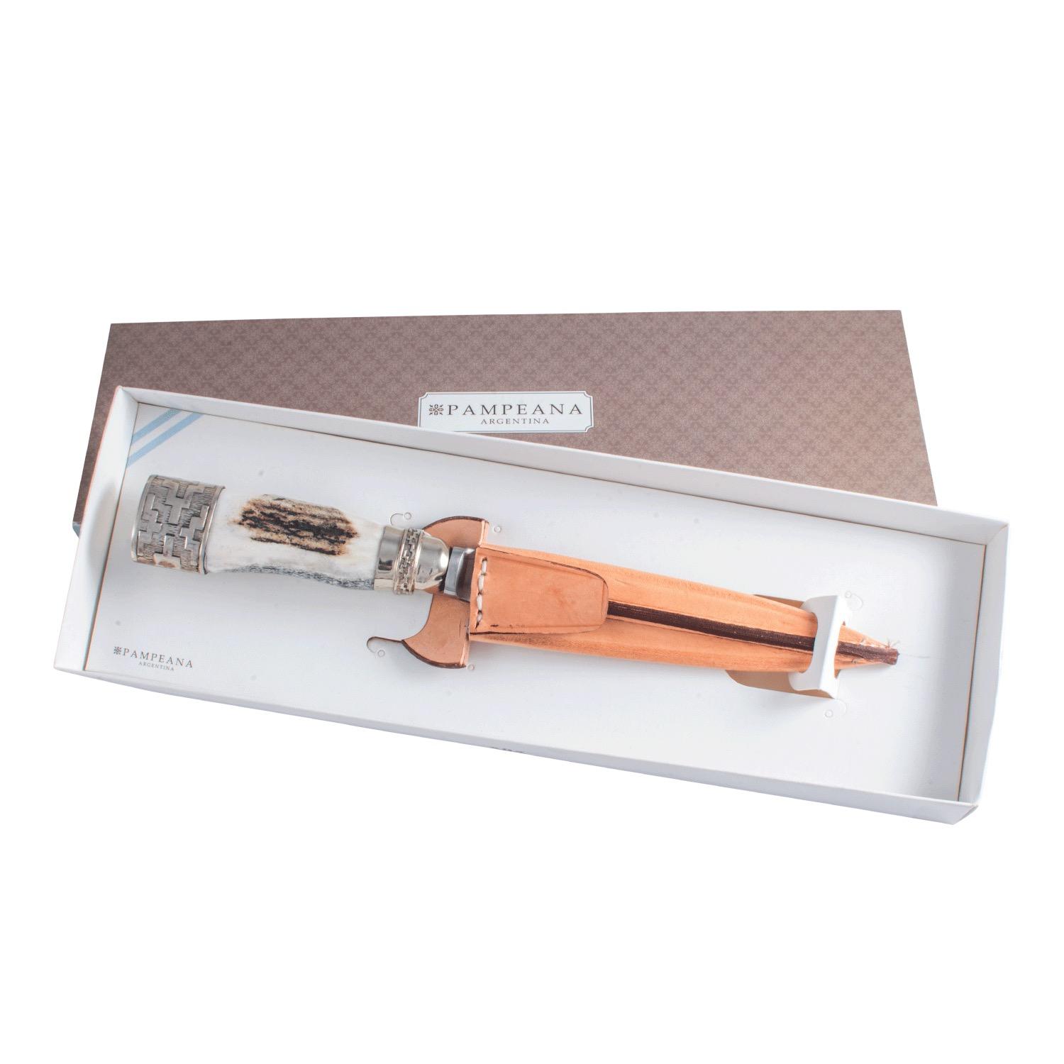 Cuchillo 14cm Inox. Pampeana Encabado En Ciervo Y Alpaca En Vaina De Cuero Claro Con Packaging
