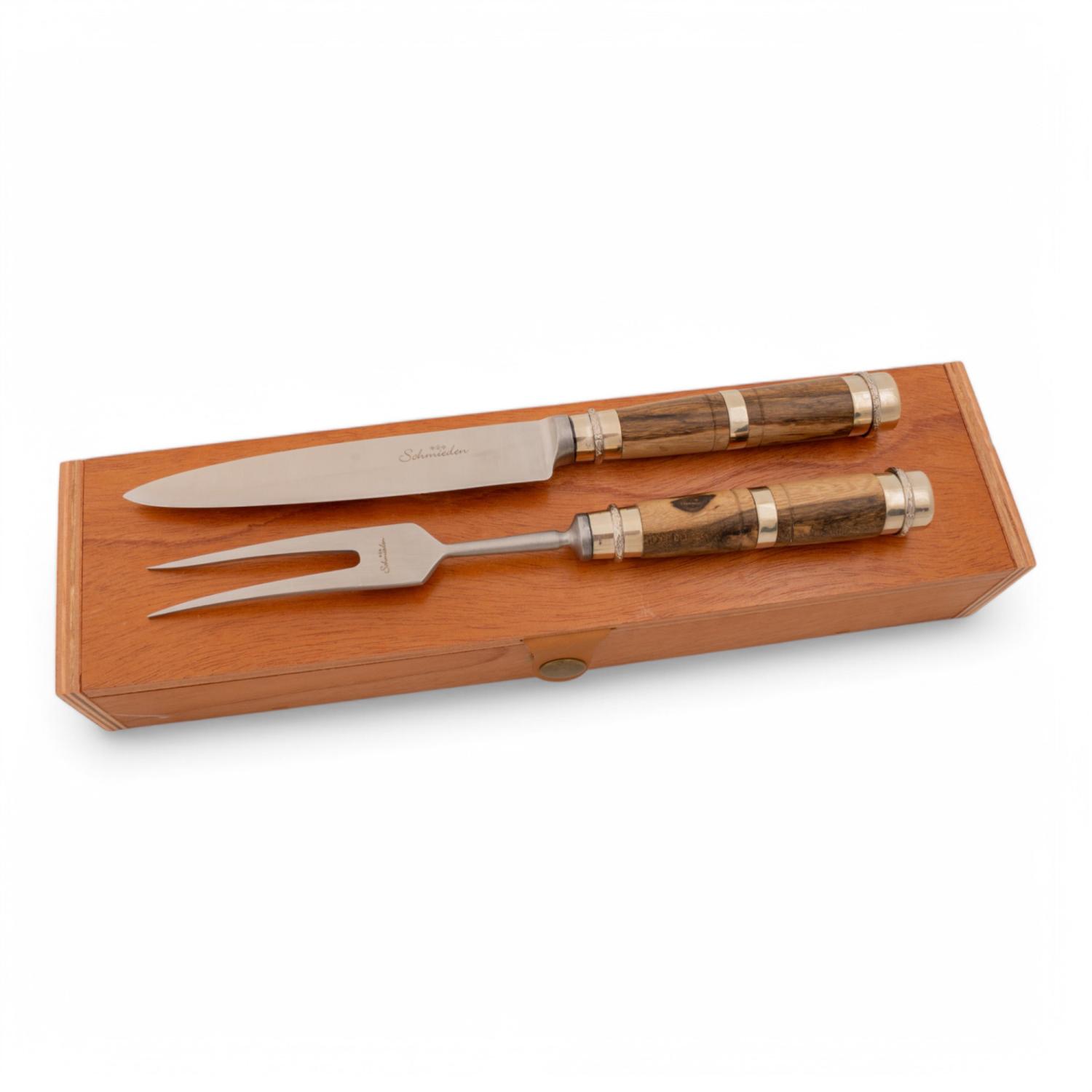 Juego De Cubierto Individual En Madera Y Alpaca 3 Virolas Linea Fina En Caja De Madera Cedro Lustrada Hoja De 14 cm y Tenedor 2 Dientes En Acero Inoxidable Marca Schmieden Estilo AIRES DE SAN TELMO
