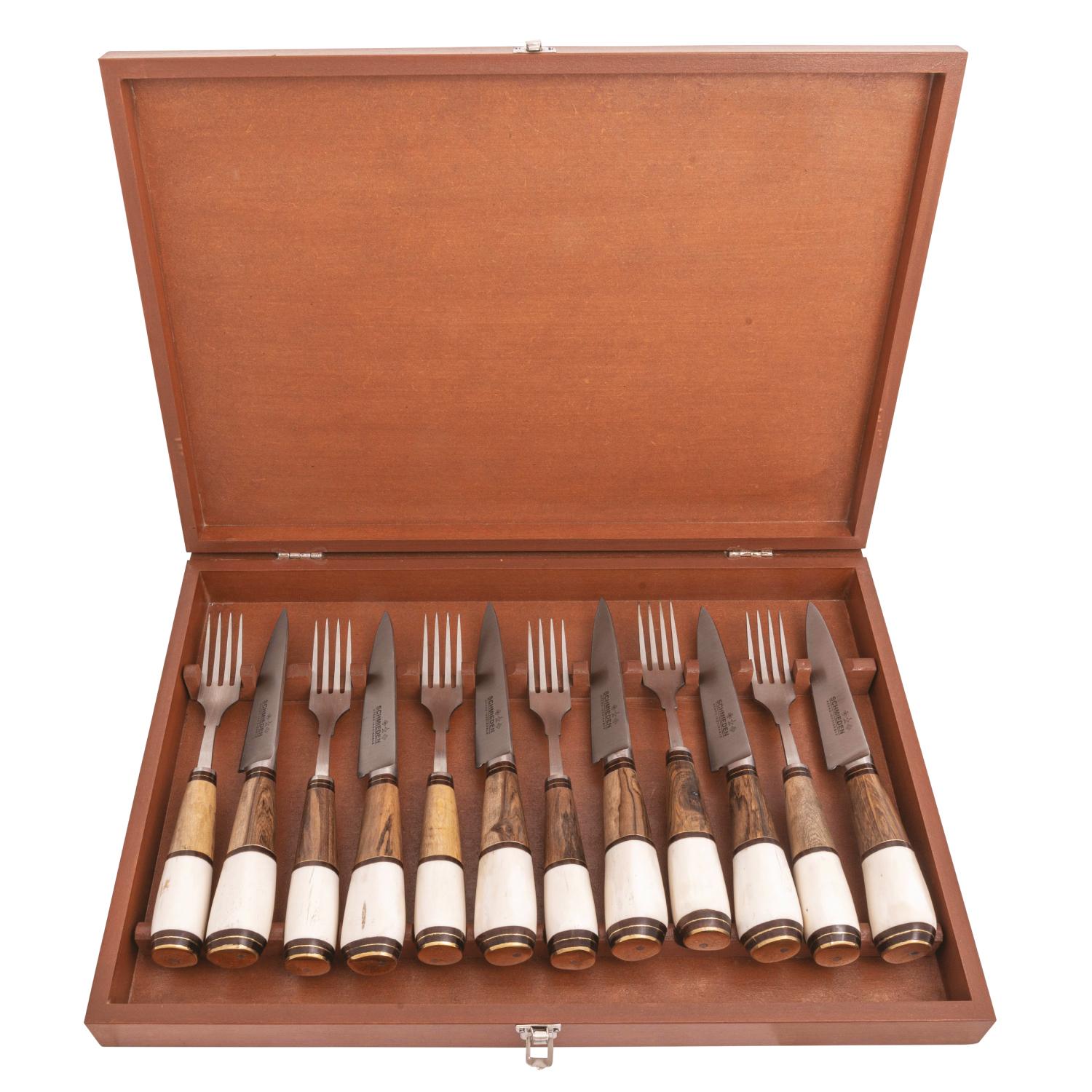 Juego De Tenedores y Cuchillos En Acero Inoxidable 5 pulgadas Por 12 Unidades Encabados madera y Hueso Con Caja De Madera Claro Eco