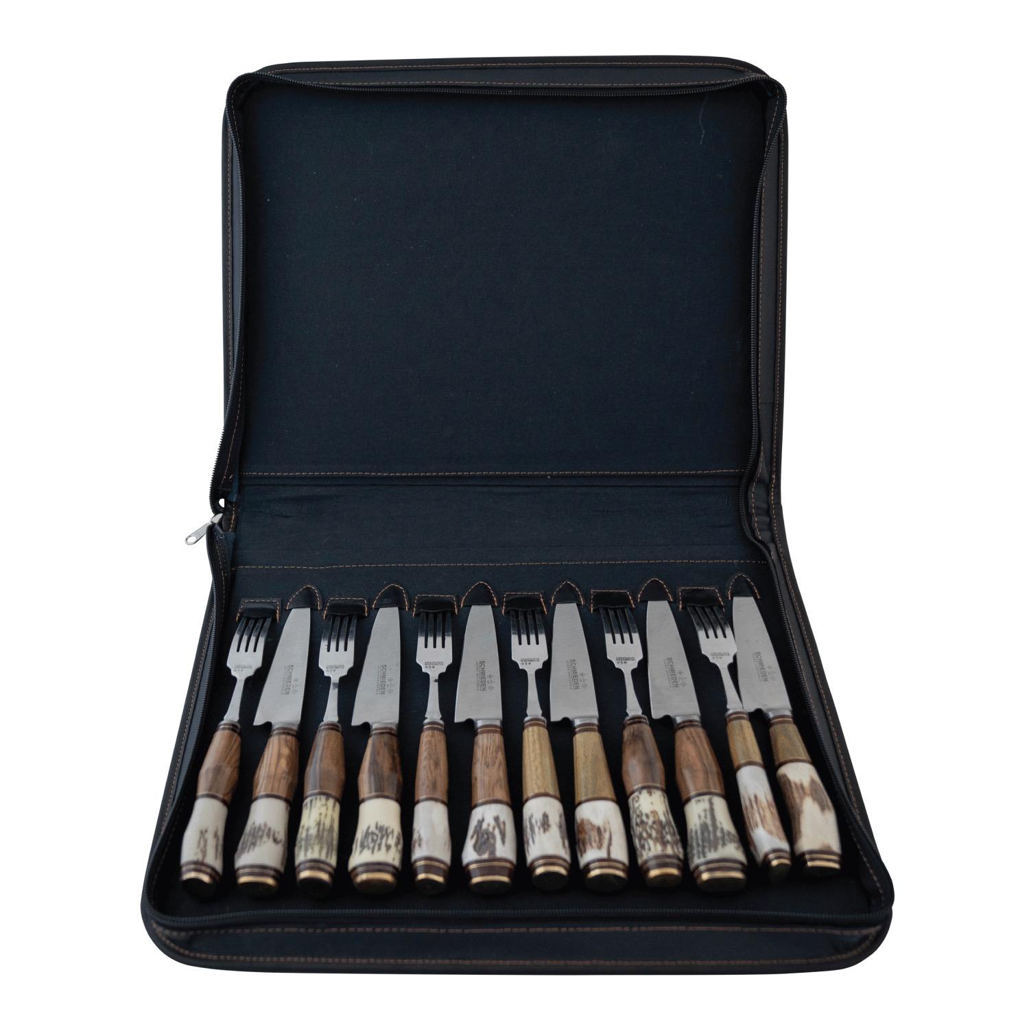 Juego De Tenedores y Cuchillos En Acero Inoxidable Por 12 Unidades Encabados En Madera y Ciervo Con Estuche En Cuero Oscuro