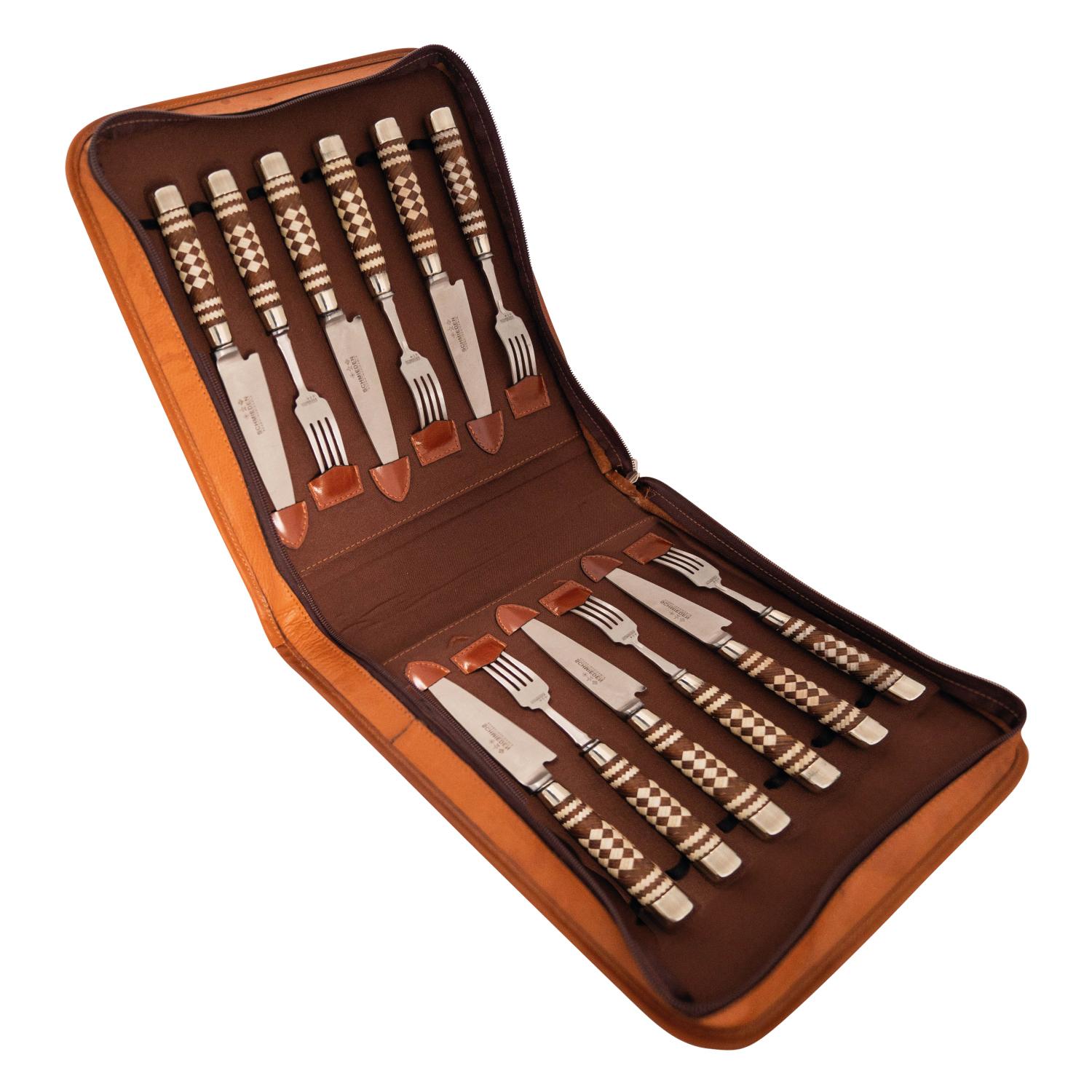 Juego De Tenedores y Cuchillos En Acero Inoxidable Por 12 Unidades. Cabos Trenzados Varios Modelos – En Estuche En Cuero Claro