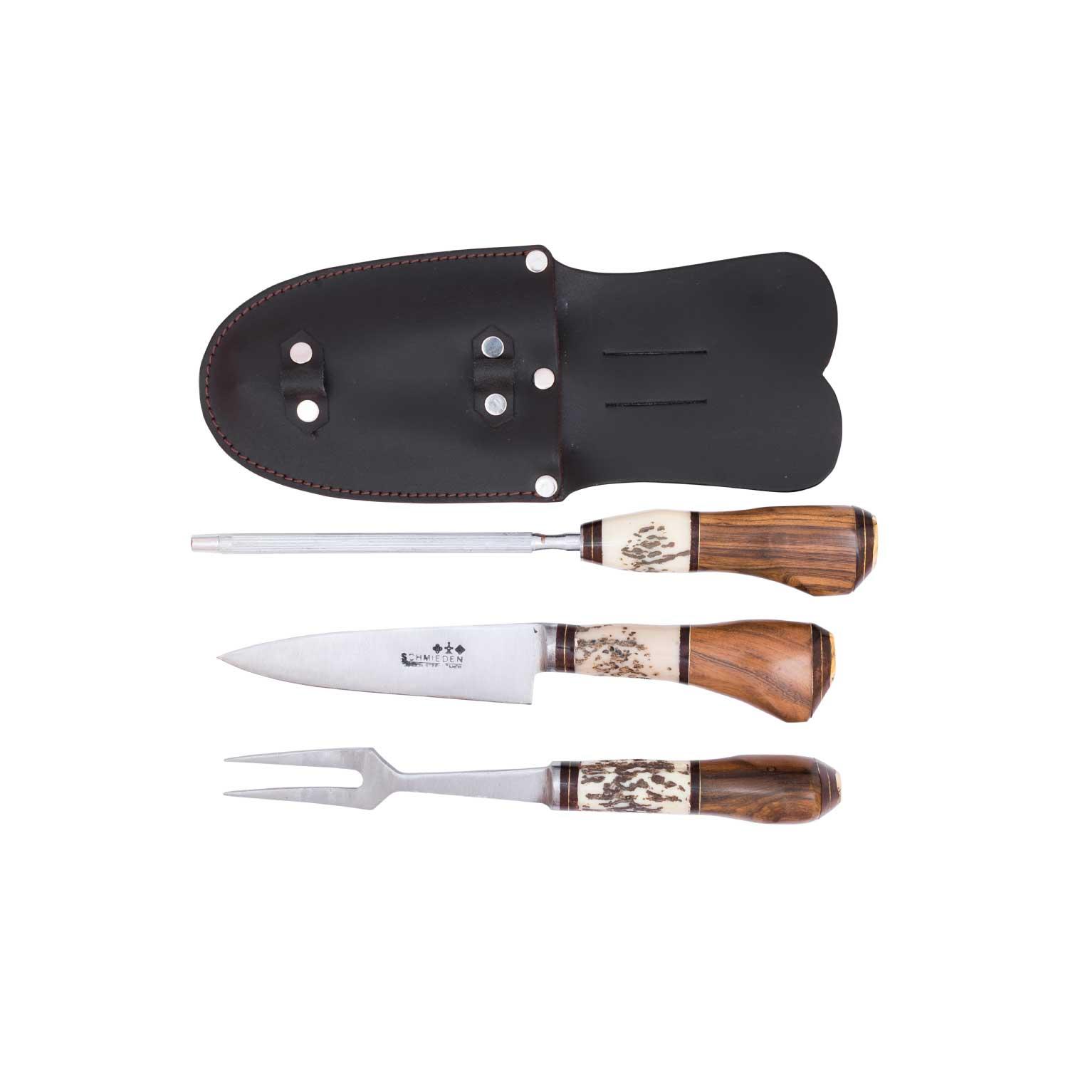Juego Para Asado Cuchillo,Tenedor y Chaira Acero Carbono 12 Cm Encabados En Madera, Ciervo o Materiales Varios Con Vaina De Vaqueta