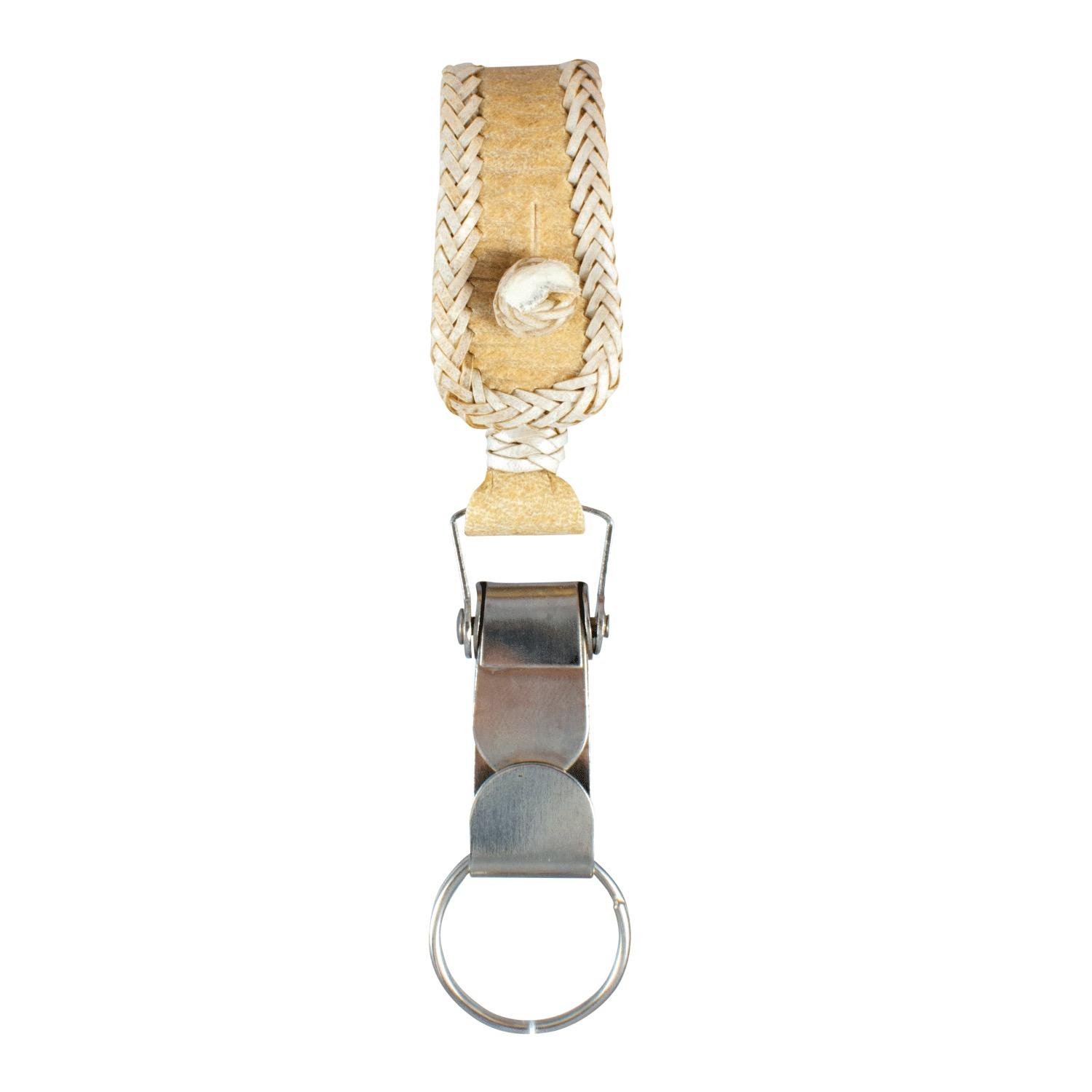 Llavero De Cuero Crudo Tejido En Borde Con Boton y Mosqueton Frontal Ancho