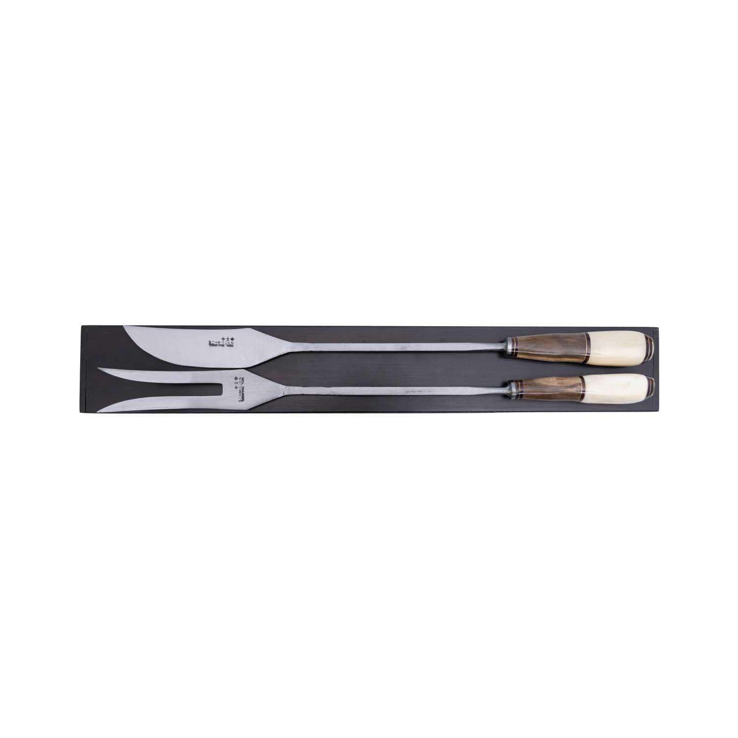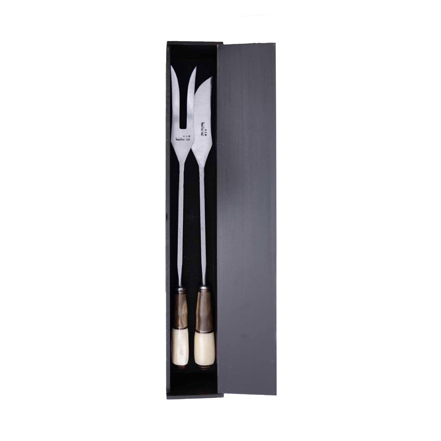 Juego Parrillero Regional Cuchillo Y Tenedor Hoja de Acero Carbono Schmieden 30 Cm Encabado Con Madera y Ciervo y Caja Largo Total 42 Cm