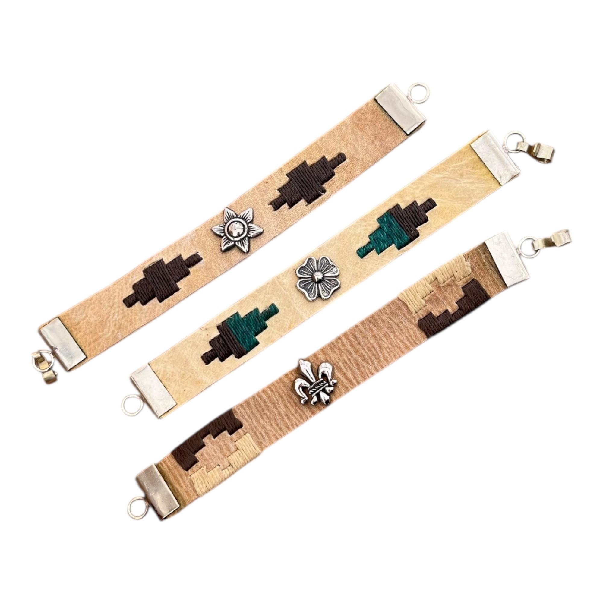 Pulsera De Cuero Crudo Bordada Con Aplique