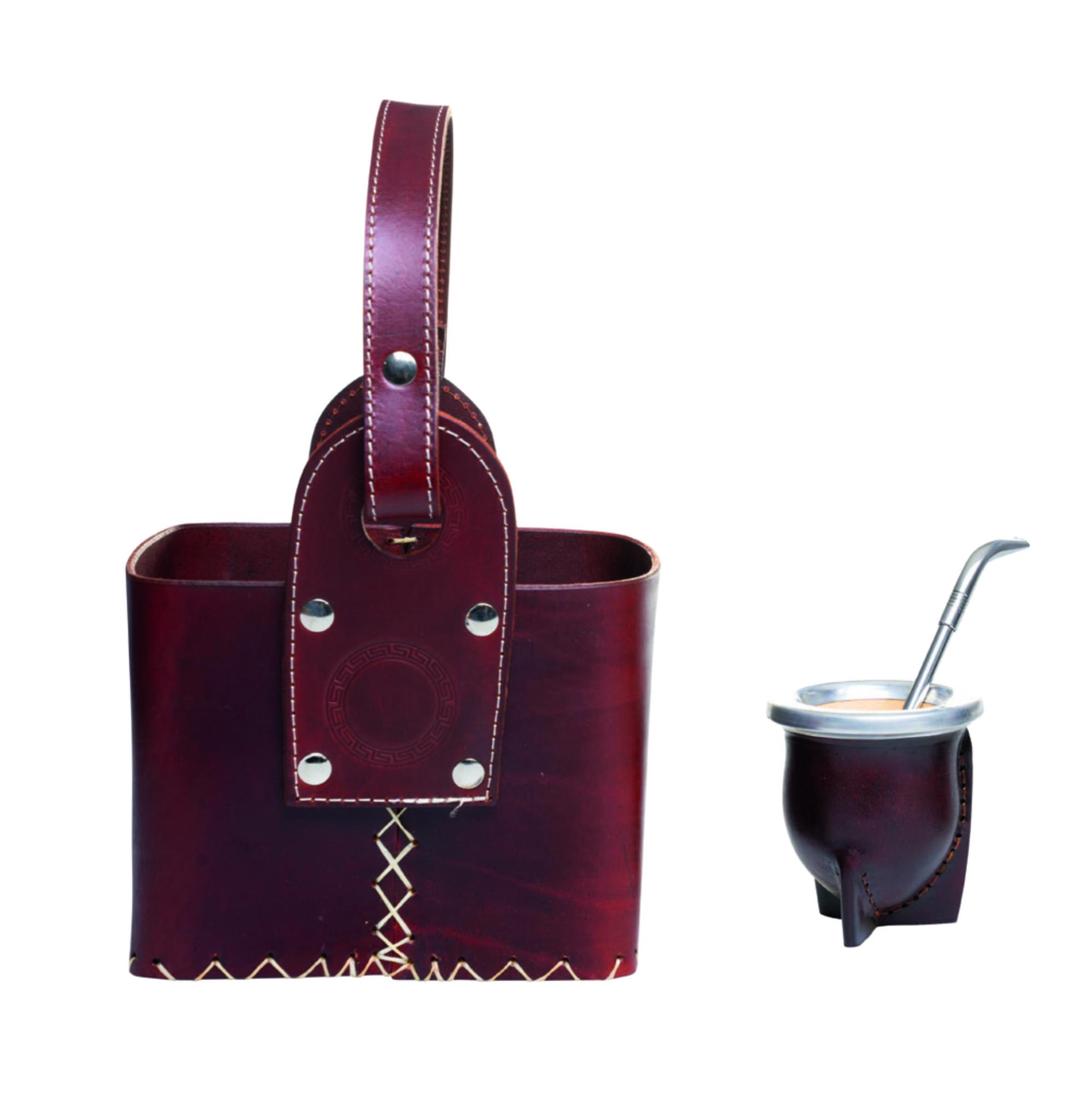 Porta Termo Canasta Con Mate En Calabaza Forrado en cuero Y Bombilla De Acero Inodixidable Desarmable