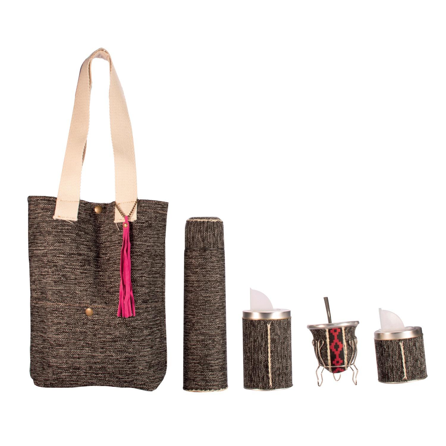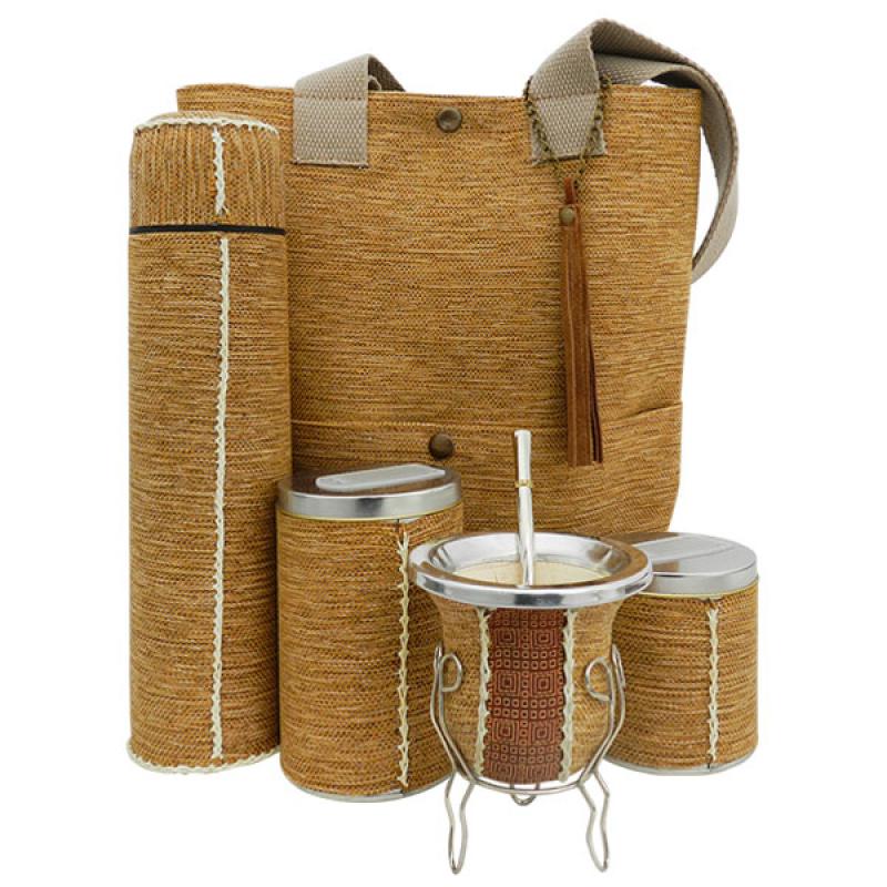 Set Matero Mate De Calabaza Yerbera, Azucarera y Termo De Acero Inoxidable Forrado En Arpillera Con Bolso Fino